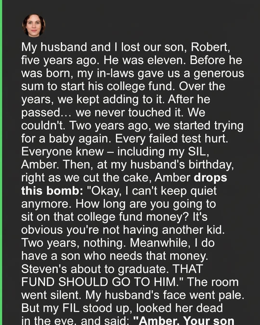 At my husband’s recent birthday gathering, that sacred memory was unexpectedly challenged. His sister, Amber, mentioned the college fund and suggested we give the money to her teenage son instead. The air in the room grew heavy, and I felt every eye turn toward us. Before I could say a word, my father-in-law spoke with calm authority, reminding her that both grandsons had been given equal funds — and that hers had long been used. His words, though gentle, carried an unshakable truth: fairness should never be rewritten by convenience.