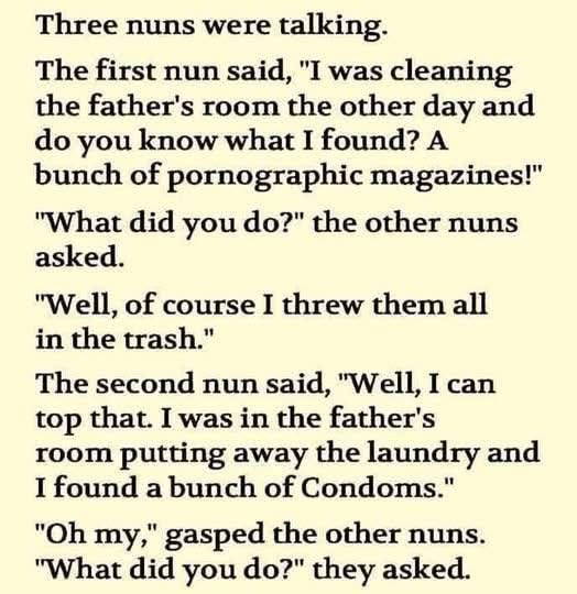 🚨 Holy Scandals Unveiled! 😱 Wait Till You Hear What the Third Nun Said! 😂Check the first comment!dif Posted on December 18, 2025 By admin No Comments on 🚨 Holy Scandals Unveiled! 😱 Wait Till You Hear What the Third Nun Said! 😂Check the first comment!dif Three nuns were talking. The first nun said, “I was cleaning the father’s room the other day and do you know what I found? A bunch of pornographic magazines!” “What did you do?” the other nuns asked…. Uncategorized
