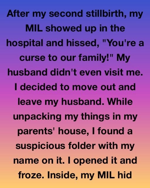 After my second heartbreaking pregnancy loss, my mother-in-law confronted me at the hospital with cruel words that left me stunned. My husband didn’t visit, offer comfort, or answer my messages, and something inside me broke. I moved out shortly after, taking only a few boxes of belongings. While unpacking at my parents’ home, I came across a folder with my name on it, tucked away with papers that looked official.