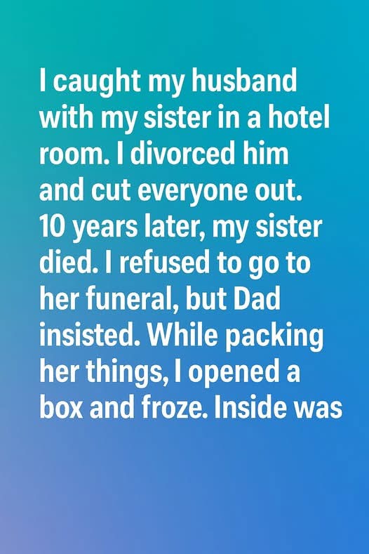 Ten years ago, my life collapsed in a single moment. I walked into a hotel room and found my husband and my sister together. In my shock and heartbreak, I never paused to ask questions. I divorced him immediately, cut ties with my entire family, and built a wall around my life so high that nothing from the past could reach me. For a decade, I carried anger like armor. Then my sister passed away, and despite my refusal to attend the funeral, my father begged me to help sort her belongings.