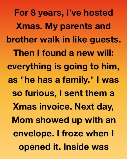 The realization didn’t come during the holidays. It came months later while helping my parents sort paperwork after a small health concern. Among the documents was a finalized will. Everything—home, savings, family keepsakes—was designated for my brother. The explanation was brief: he had a family. I didn’t confront anyone that day. I went home and sat with the truth longer than I expected. What hurt most wasn’t the paperwork—it was understanding how quietly my contributions had been discounted.