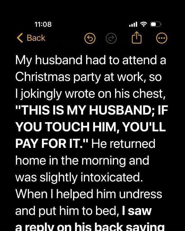 It began as a harmless prank—a playful note I scribbled on my husband’s chest before he left for his work Christmas party. The house smelled of cinnamon and pine, the tree lights glowing warmly, and the holiday spirit filled the air. Travis emerged from the bedroom, tie adjusted, confident and cheerful. Grinning, I wrote, “This is my husband. If you touch him, you’ll pay for it. – M.” He laughed, shaking his head, appreciating the joke.