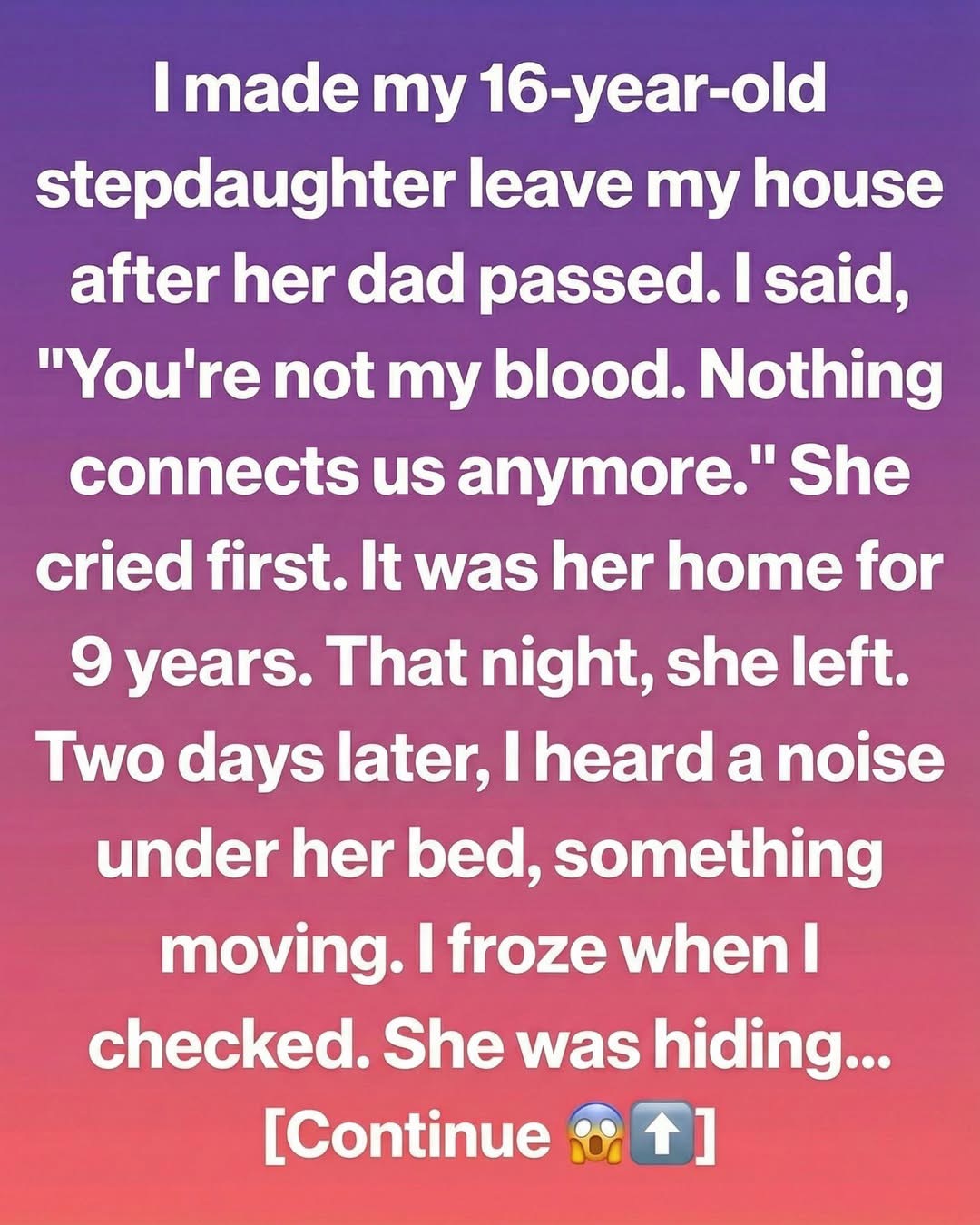 The next two days passed slowly. I avoided her room, convincing myself it was better not to look inside. But on the third night, as I walked down the hallway, I heard a faint sound coming from beneath her bed—a soft rustle, like fabric shifting. My heart jumped. I froze, unsure what I was afraid of, then knelt down to look. What I found wasn’t what I expected. Hidden neatly under the bed were several small boxes, folded clothes, and a notebook. They weren’t forgotten items. They were carefully arranged, as if she planned to come back for them someday. Among them was a photo of her and her father, taped to the notebook’s cover. The realization hit me all at once: she hadn’t left because she stopped caring. She left because I told her she didn’t belong.
