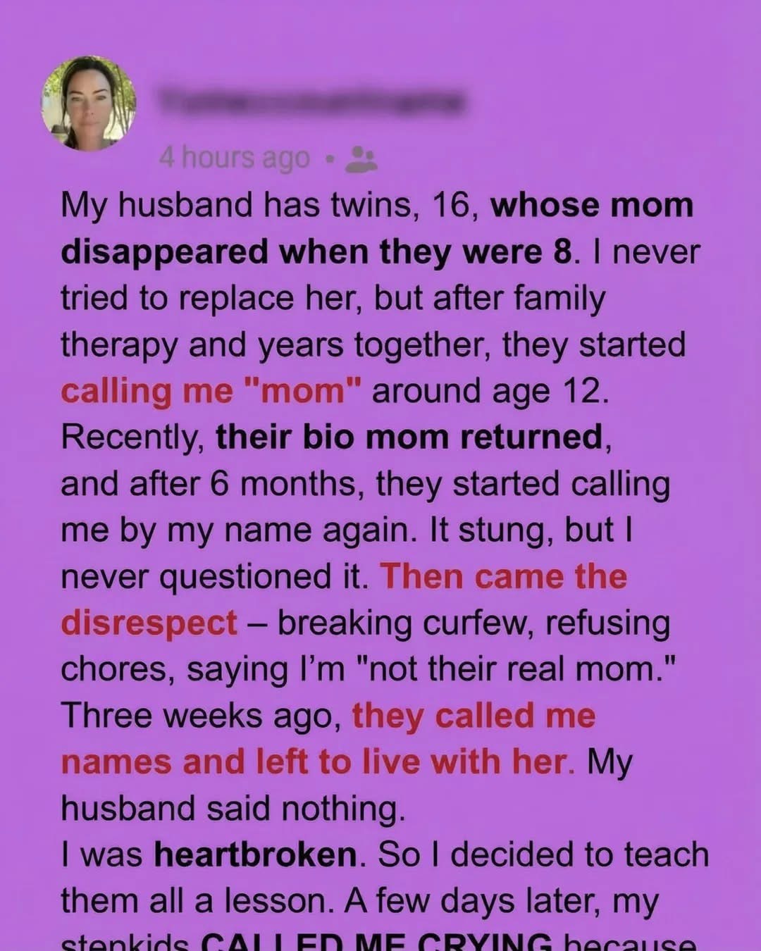 Then their biological mother returned. At first, I stepped back with grace, encouraging them to reconnect and leaving space for their complicated emotions. I understood the pull—she was part of their story long before I was. But months passed, and the shift became painful. “Mom” disappeared, replaced by my first name. Then came the distance: broken curfews, refusal to help at home, sharp words meant to wound. They told me I wasn’t their real parent anymore. What hurt most wasn’t just their behavior—it was my husband’s silence. He watched the tension grow and said nothing, leaving me to absorb the impact alone.