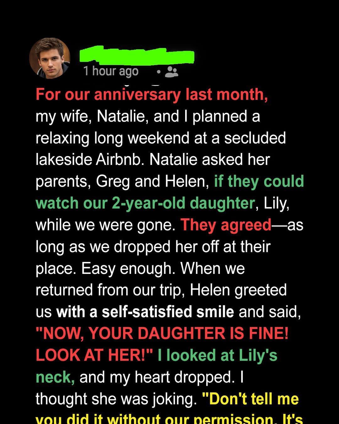When I returned from a quiet anniversary weekend with my wife Natalie, her mother greeted us with a smile that felt overly proud. That’s when she casually announced they had taken our two-year-old daughter, Lily, to church and had her baptized without our consent. I stood frozen as I noticed a small necklace on Lily’s neck, a symbol of a ceremony I had never agreed to. On the drive home, Natalie insisted it was “just words and water,” trying to calm me. But to me, it felt like a decision about our child made without me as a parent.