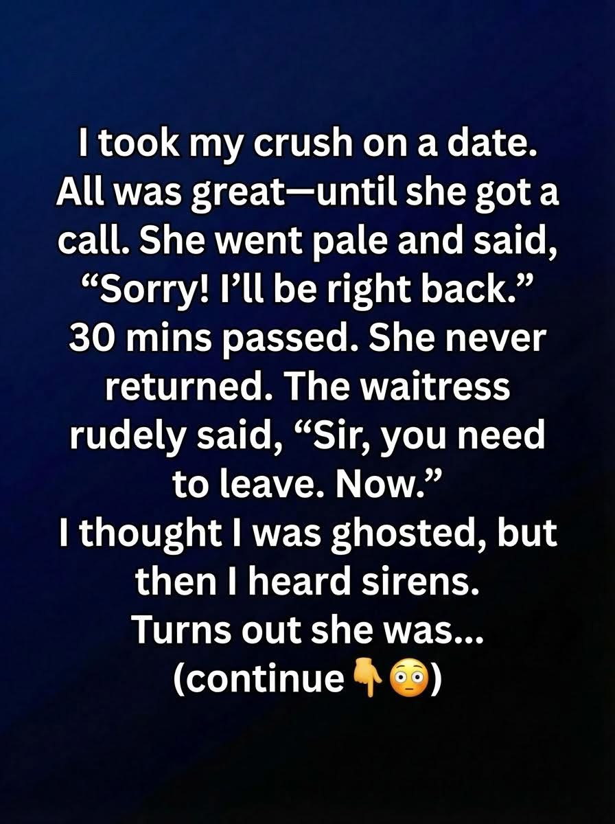 Minutes stretched into something heavier than time. The waiter refilled my water twice without asking, and each clink of the glass felt louder than it should have been. I rehearsed explanations in my head—emergencies, family issues, misunderstandings—anything kinder than the word “ghosted,” which crept in anyway. When the waitress finally approached, her voice was tense, not unkind but urgent, telling me I needed to leave immediately. Confusion set in before embarrassment could. As I stood, distant sirens cut through the night air, growing louder, closer, wrapping the street in a restless echo that made my chest tighten.
