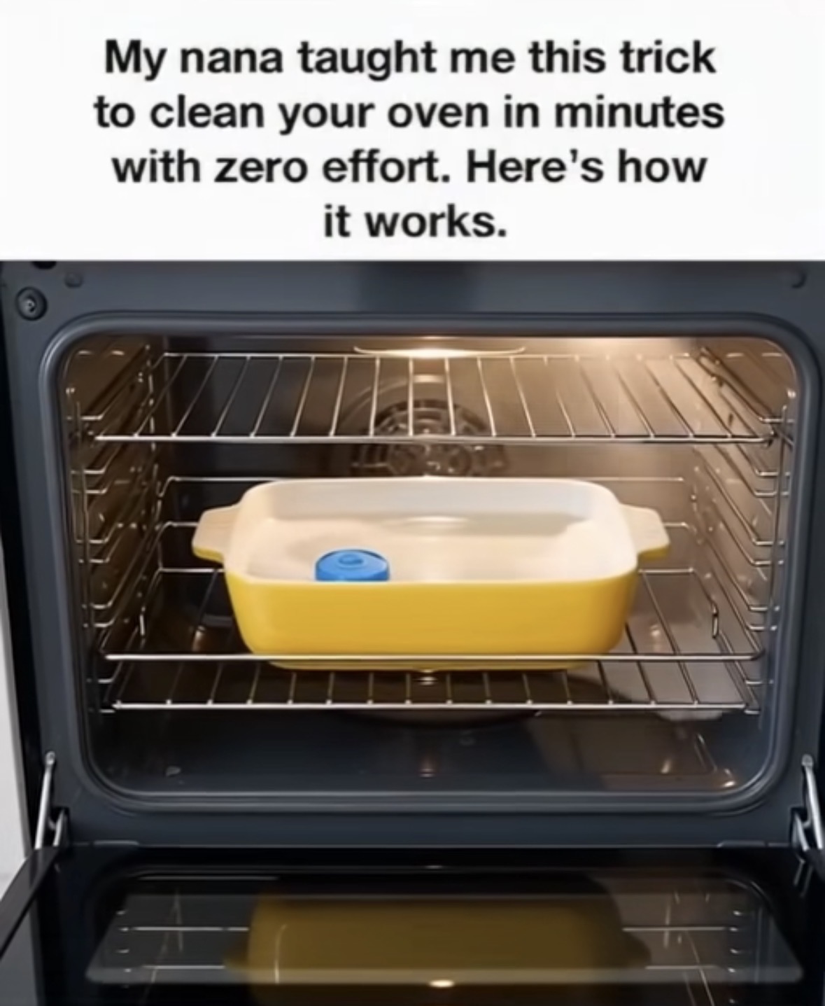 Cleaning an oven is often a dreaded chore, but Nana’s no-fuss trick makes it surprisingly easy. Instead of harsh chemicals and hours of scrubbing, you only need three items: a dishwashing pod, a heatproof casserole dish, and water. Start by preheating your oven to 200°F (93°C). Fill the dish with water and drop in the dishwashing pod.