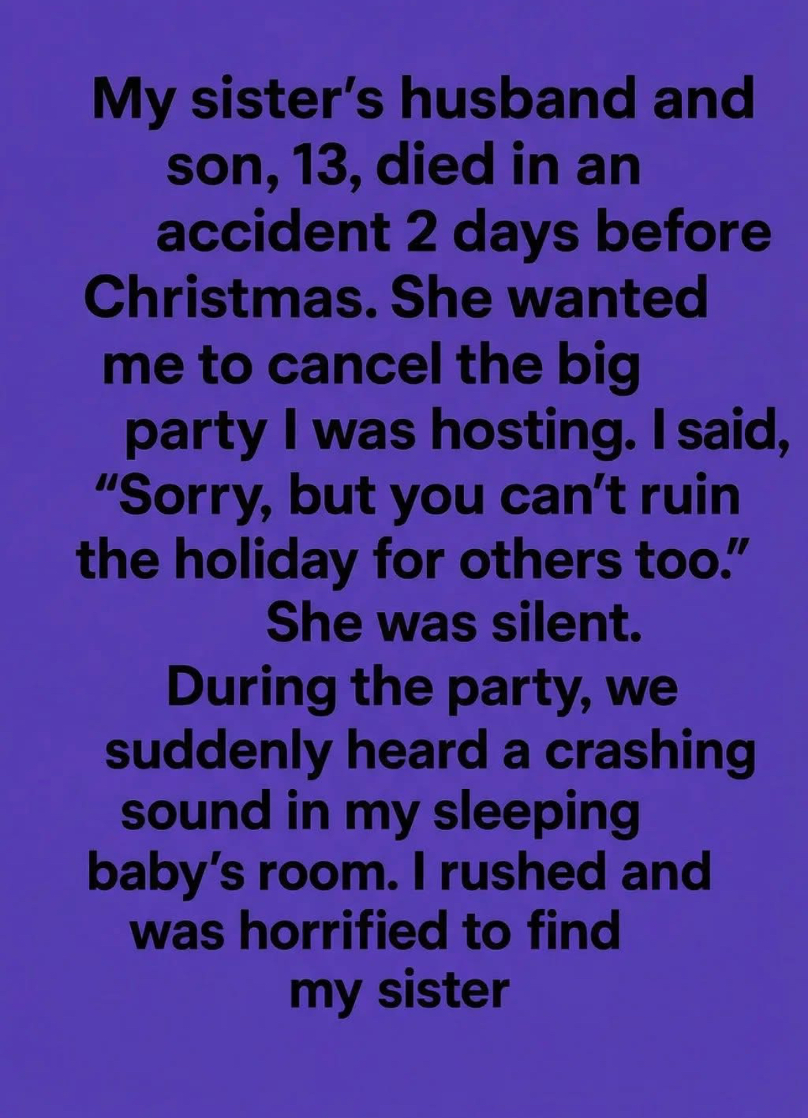 Two days before Christmas, my sister lost her husband and her 13-year-old son in a tragic accident. The call came just as I was finishing the final preparations for the holiday party I host every year. Lights were strung across the porch, food was ordered, and guests had already confirmed. When she asked me, in a trembling voice, to cancel the celebration, I hesitated. I told her gently—but firmly—that I couldn’t undo plans for dozens of people. I convinced myself that life had to go on, that one family’s grief did not have to silence everyone else’s joy. She didn’t argue. She simply went quiet, and that silence should have told me more than words ever could.