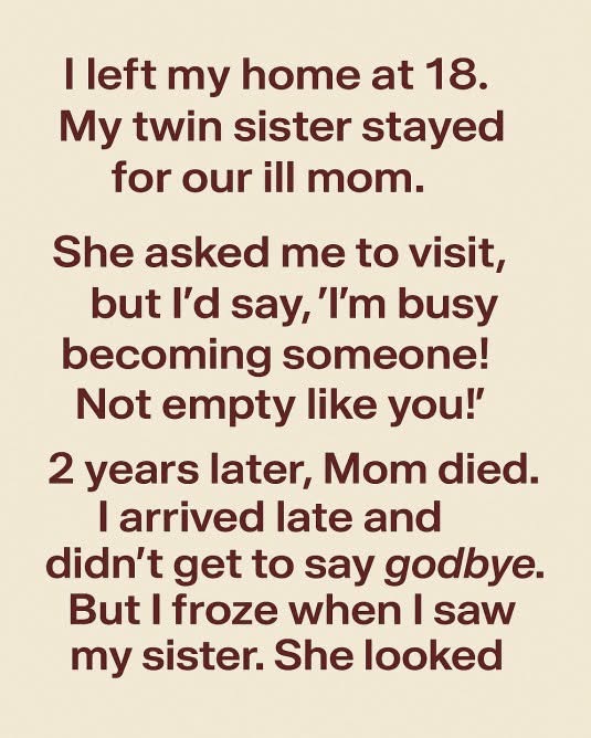 I left home at eighteen with a suitcase, a scholarship, and a stubborn belief that success meant leaving everything familiar behind. My twin sister stayed because our mother’s health was already declining. She tried to explain that caring for Mom mattered just as much as chasing dreams, but I brushed her off with careless confidence. I told her I was “becoming someone,” as if staying made her less.
