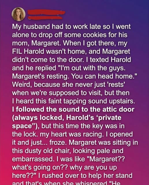 I hadn’t planned to stay long. My husband was working late, so I decided to drop off a small box of cookies for his mother, Margaret—a simple gesture, nothing more. When I arrived, the house felt unusually quiet. My father-in-law wasn’t home, and Margaret didn’t answer the door, even though her car was in the driveway. I texted her husband, who replied casually that she was resting and suggested I head back home. It should have eased my mind, but it didn’t. Margaret never “rested” when someone was expected. As I turned toward the stairs, I heard a faint tapping sound from above—slow, uneven, and unmistakably intentional.