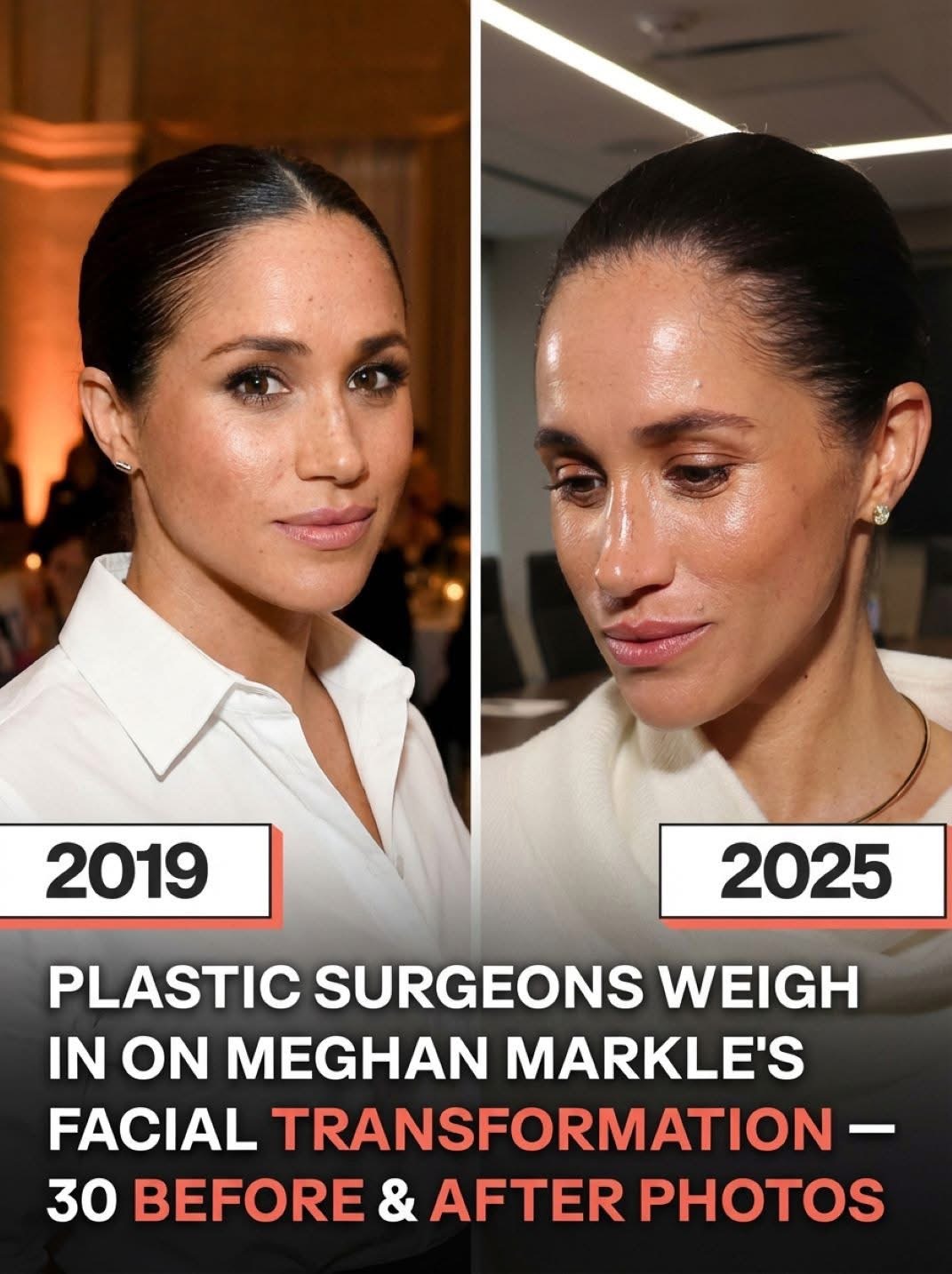 Her public profile expanded dramatically when she and Prince Harry began appearing together. Interest in her appearance intensified, with many discussing her style, makeup, and natural features—most notably her nose, which became a point of reference for beauty consultations. Specialists offered their opinions in interviews, some attributing her evolving look to skillful makeup, lighting, and natural maturity, while others speculated about possible cosmetic enhancements. Through all the noise, Meghan remained silent on the subject, allowing her evolution to speak for itself. Her early years as a duchess revealed a serene and polished image, highlighting her growing comfort with high-profile engagements and the global spotlight.