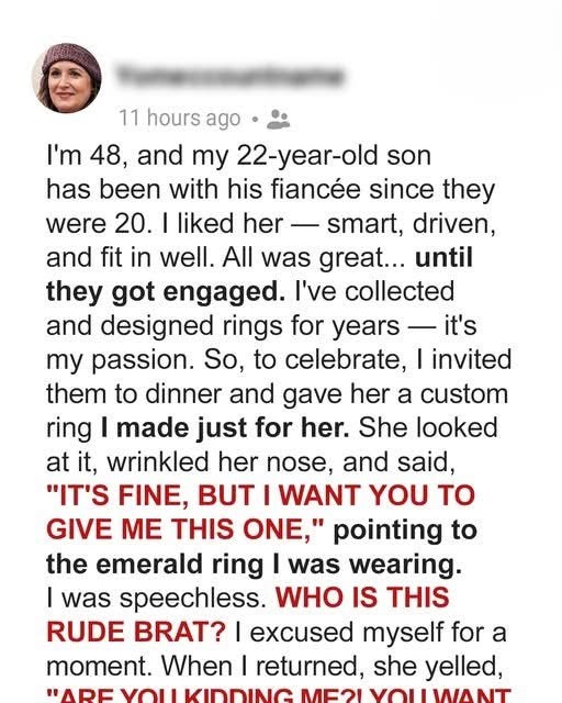 The evening I presented the ring, I felt so proud. Alice opened the box, admired the sapphire and diamonds, and smiled politely — but then her eyes drifted to the emerald ring on my hand, one of the first pieces I ever made and one that carries years of memories. To my surprise, she asked for it instead, insisting it should be “her engagement ring” since it looked like a family heirloom. Her tone wasn’t unkind, but it felt more like a demand than a request, and my heart sank. I gently explained its personal importance, offering instead to help her design a meaningful piece of her own someday.