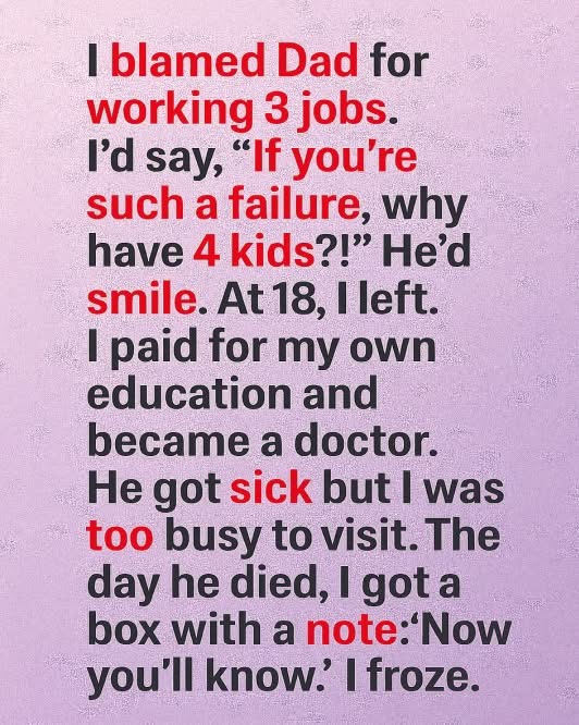 Receipts from quick diner meals, bank statements showing small payments toward my college, and handwritten notes calculating overtime revealed a truth I had never acknowledged: he had been supporting me quietly all along, even when I believed I was doing it all on my own. Deeper in the box, wrapped in a faded cloth, was his old gold watch. I had teased him about that watch countless times, but now its meaning was unmistakable. On the back were our initials engraved around the words “My purpose,” a silent reminder he carried daily. Holding it, I finally saw the life he lived—one built on sacrifice, routine, and unwavering love.That evening, sitting on the porch with the watch ticking steadily in my hand, I felt his presence in a way I never had before. His letter didn’t ask for apologies; it simply offered the truth he hoped I was ready to understand. And in that moment, I made a quiet promise: I would live with the same quiet generosity he showed every day, carrying his legacy forward with gratitude rather than regret.