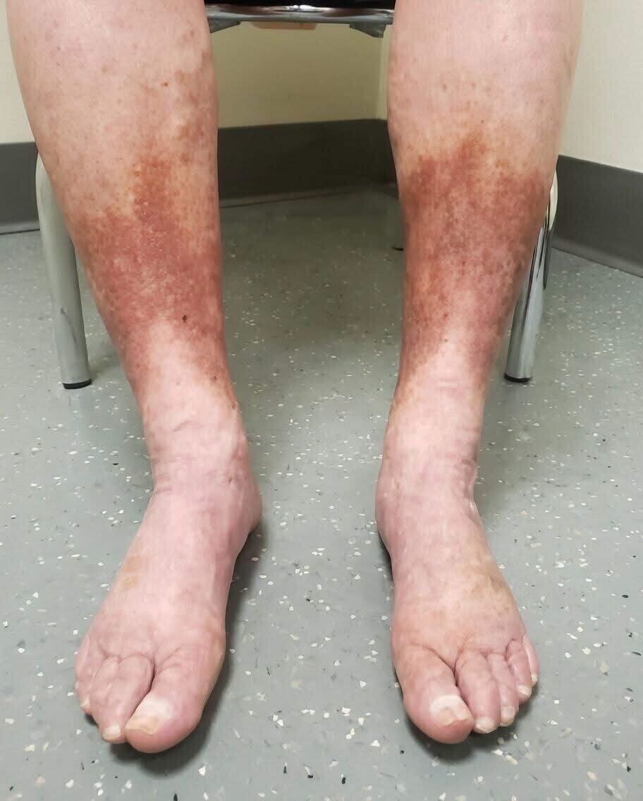 The discoloration seen in the legs is often the result of inflammation and the breakdown of red blood cells in the tissues. When blood pools in the veins, it increases pressure, causing small vessels to leak.