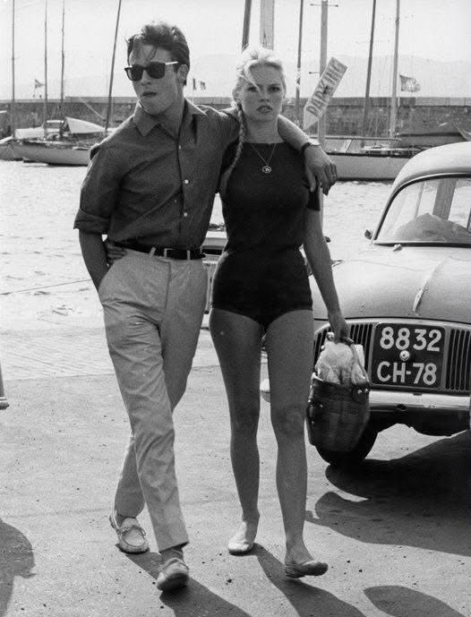 A young guy and lady dressed in throwback attire are seen standing in front of a car in what appears to be a standard 1980s image at first glance.